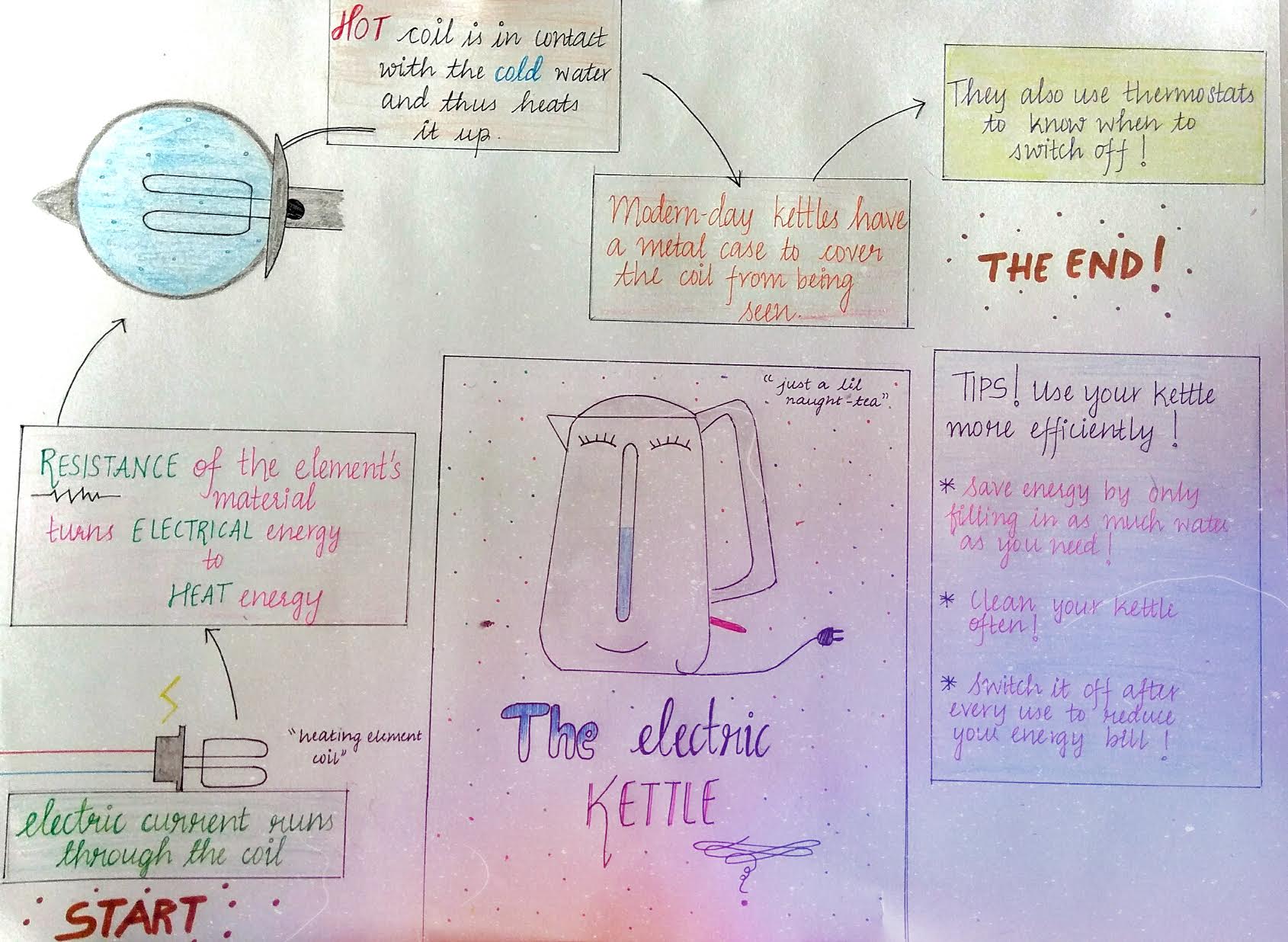 Blow off all the steam already! How does a kettle do that? Let’s find out! Note that a kettle uses a thermostat too. I’ve only mentioned it here. If you want the working of the thermostat make sure to check out the Electric Iron comic! In this drawing I’ve also included an extra column relating to measures that can be taken to save energy! So make sure you check that out and keep that in mind 🙂 Meet the Electric Kettle! 💕